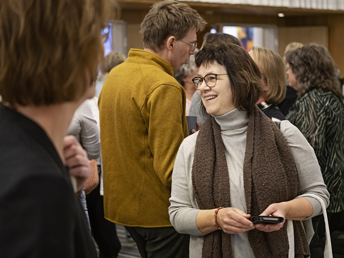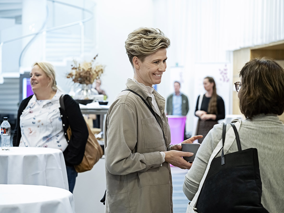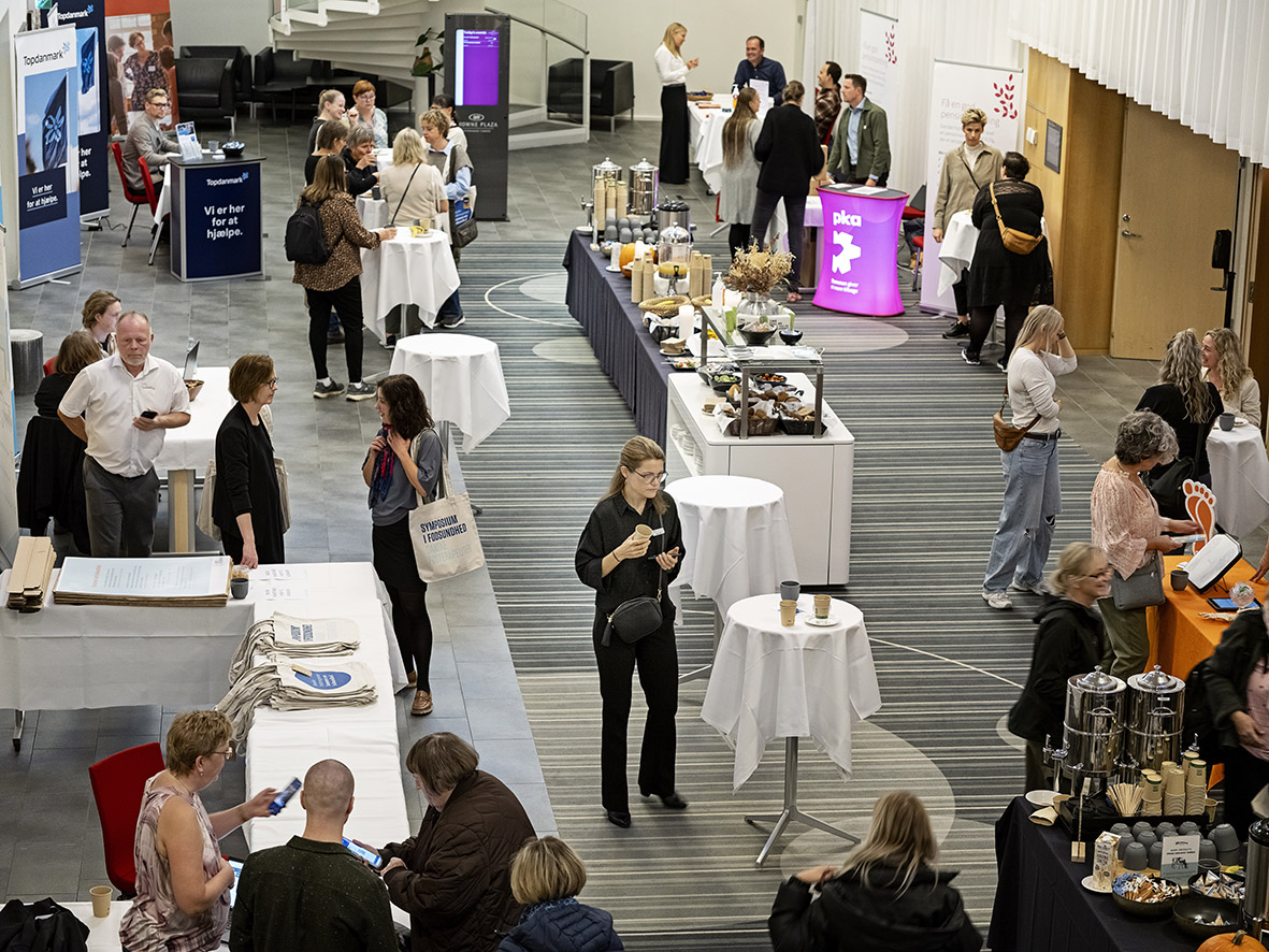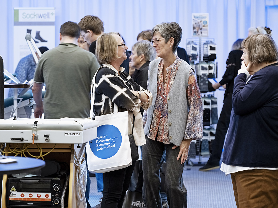 Ved store, runde borde i salen er deltagere ved at finde en plads, mens andre går på opdagelse blandt flere end 20 udstillere i et nabolokale. Her står borde og lokker med støttestrømper i mønstre for enhver smag, sko til næsten alle slags fødder og stole til alle former for patienter.